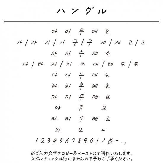 ※ご入力いただいたままコピー&ペーストにて制作いたします。日本語でご入力いただいた場合は日本語で制作いたします。ハングルをご希望の場合は、システムを通すと文字化けしてしまうため、【プリントする文字】には「ハングル希望」とご入力いただき、ご注文後、メール(ご注文確認メールに返信)または公式LINEにて【受注番号もしくはご注文時のお名前】と【プリントする文字】をご連絡ください。未入力の場合はお名前のプリントなしで制作いたします。