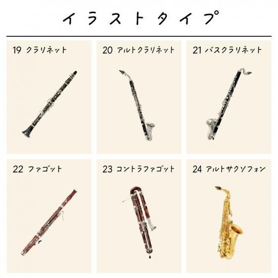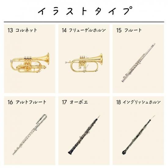 ヴァイオリン ヴィオラ チェロ コントラバス B♭トランペット Cトランペット ピッコロトランペット ポケットトランペット トロンボーン ホルン ユーフォニアム チューバ コルネット フリューゲルホルン フルート アルトフルート オーボエ イングリッシュホルン クラリネット アルトクラリネット バスクラリネット ファゴット コントラファゴット アルトサクソフォン テナーサクソフォン ソプラノサクソフォン バリトンサクソフォン ティンパニ シンバル トライアングル スネアドラム バスドラム ヴィブラフォン マリンバ ピアノ チェレスタ ハープ クラシックギター アコースティックギター エレキギター エレキベース ドラム